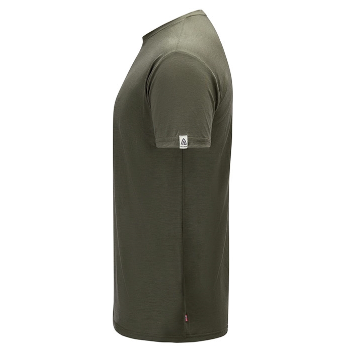 Merinould har naturlige temperaturregulerende egenskaber, som hjælper med at holde kroppen behageligt tempereret i både varme og kølige forhold. Samtidig transporterer ulden fugt væk fra huden og kan absorbere en del fugt uden at føles våd. Materialet har også naturlige lugthæmmende egenskaber, hvilket gør, at T-shirten ofte kan bruges flere gange, før den behøver vask.