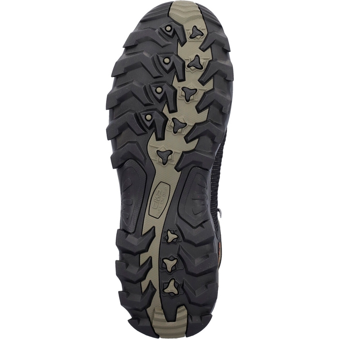 CMP Rigel Mid giver stabil støtte omkring anklen, mens den forstærkede tå- og hælkappe beskytter mod stød og slag. Den omgivende stænkbarriere holder skoen ren og beskytter mod mudder og fugt.