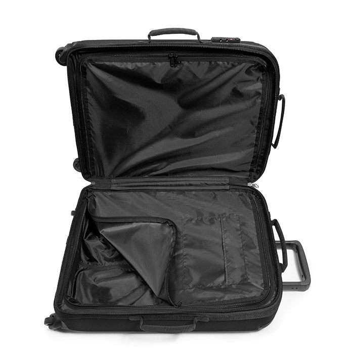Indvendigt har kufferten to lynlåslommer med stropper, der holder indholdet på plads, mens den indbyggede TSA-lås med trecifret kode giver sikkerhed uden behov for ekstra lås. Den ergonomiske håndtagsdesign og stående konstruktion gør den nem at håndtere, og 360° hjulsystemet med fire hjul sikrer problemfri bevægelse, uanset om du trækker eller skubber kufferten.