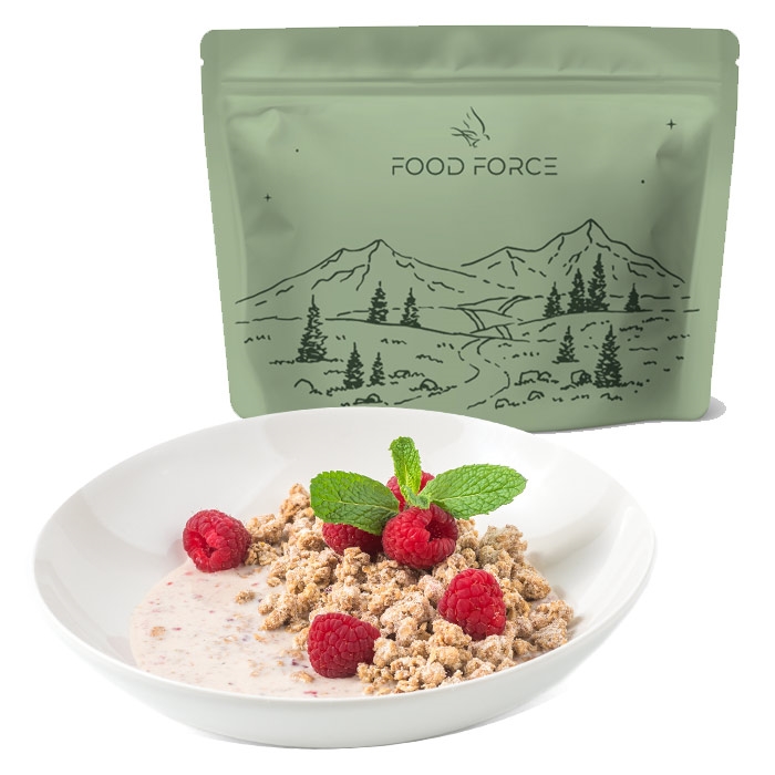 Food Force granola müsli med hindbær er et velsmagende og energirigt måltid, perfekt til morgenmad eller som et hurtigt måltid på farten. Den sprøde granola kombineret med søde hindbær giver en god start på dagen – uanset om du er på tur eller derhjemme.