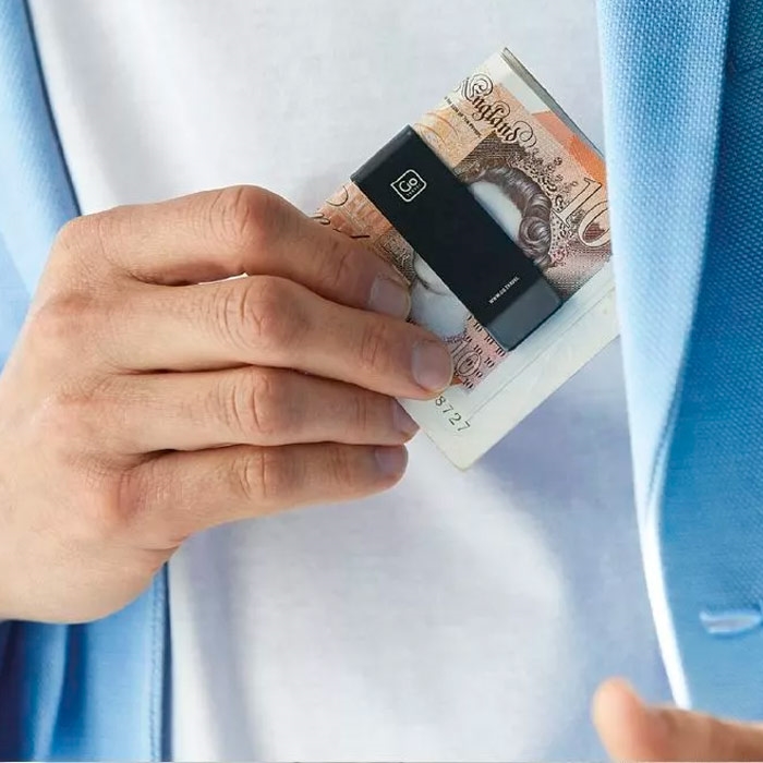 Ultrakompakt “Hide Away”-pung, sikker mod scanning og med praktisk aftagelig clip til sedler.