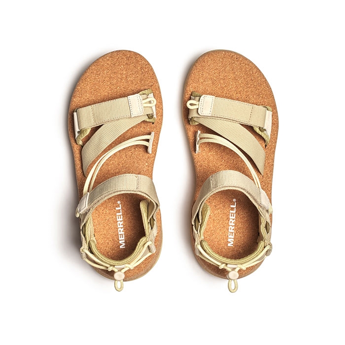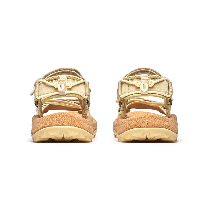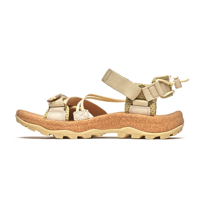 Sandalen er udstyret med en behagelig fodseng i kvalitetskork, som er beklædt med et blødt lag for at give en naturlig og støttende base under foden. Overdelen er lavet af 100% genanvendt webbing kombineret med åndbart mesh, hvilket giver en let konstruktion med god ventilation. Et hæltrækbånd i 60% genanvendt elastik gør den nem at tage af og på, mens det justerbare hook-and-loop system sikrer en fleksibel og præcis pasform.