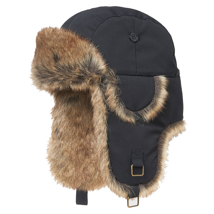 Robust vinterhue med varm syntetisk pels og justerbare øreklapper med metalspænde til fleksibel beskyttelse mod kulden.