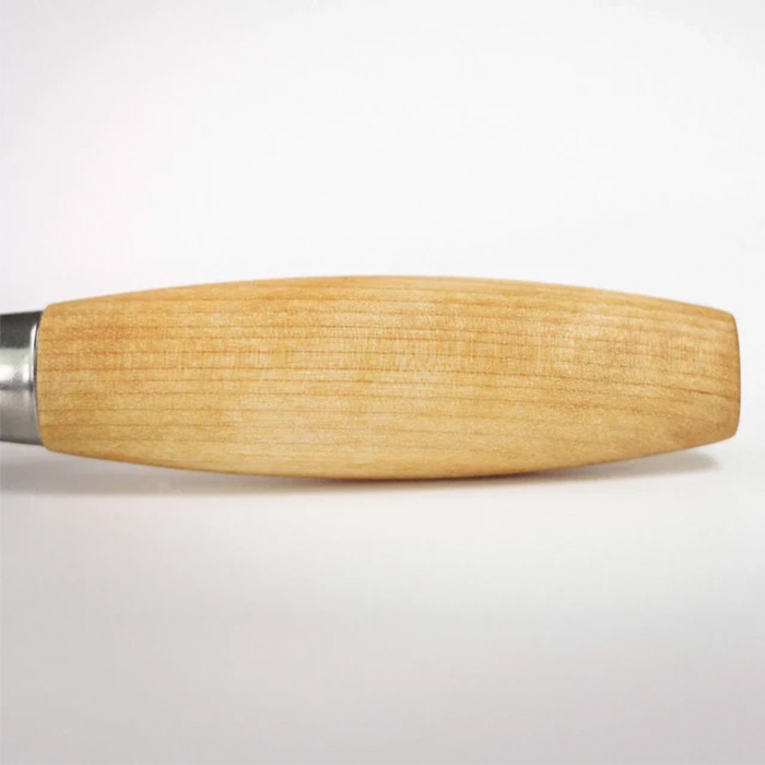 Det tøndeformede håndtag i linoliebehandlet skandinavisk birk ligger godt i hånden og giver god kontrol – også ved længere tids brug. Kniven leveres med en skede i vegetabilsk garvet svensk læder.