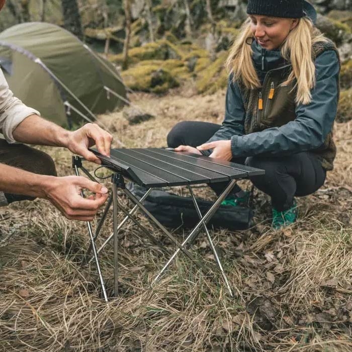 Den lette, men robuste ramme i aluminium sikrer god holdbarhed, mens den medfølgende carrybag gør transport og opbevaring enkel. Kombinationen af lav vægt og stabilitet gør bordet ideelt til camping, festivaler og friluftsliv generelt.