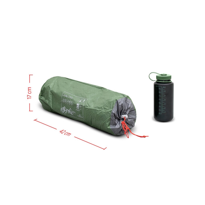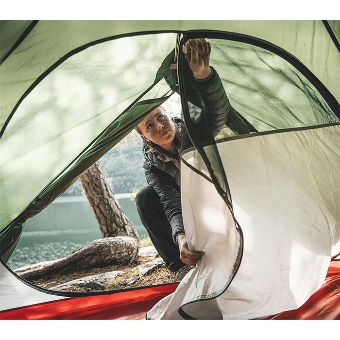 Teltet er nemt at slå op og tilbyder fleksible muligheder for både ophold, madlavning og opbevaring. De to indgange og apsisområder gør det let for begge personer at komme ind og ud, samtidig med at du kan tilpasse åbningen efter vindretning og vejrforhold. Det giver også mulighed for effektiv gennemluftning, hvilket forbedrer komforten i teltet.