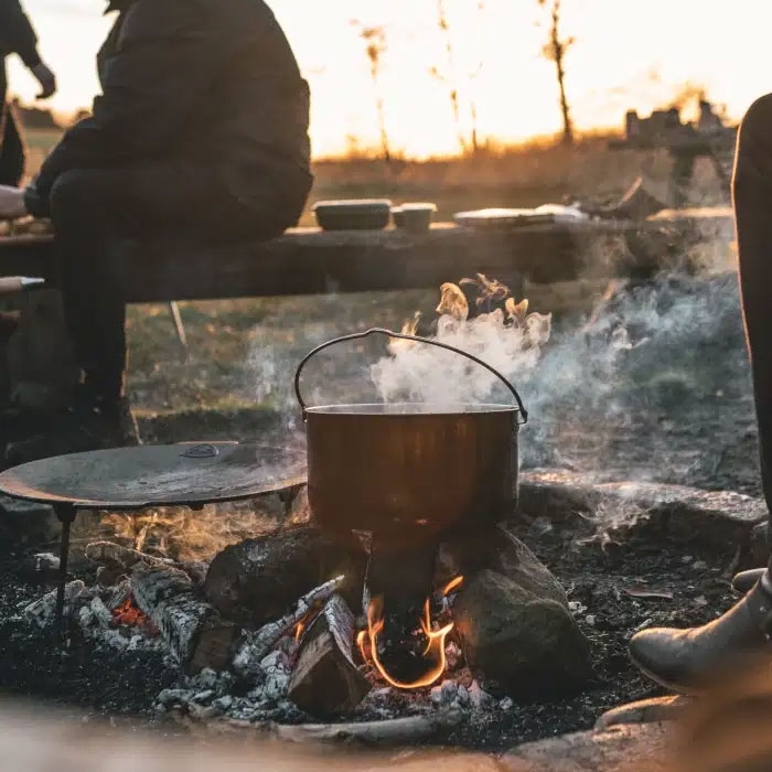 Gryden er udstyret med et specialdesignet håndtag med ophængspunkt, hvilket gør den ideel til brug over bål, eksempelvis på en tripod. Det praktiske trægreb beskytter hænderne mod varme, mens den indvendige måleskala gør det nemt at dosere væsker præcist under madlavningen.