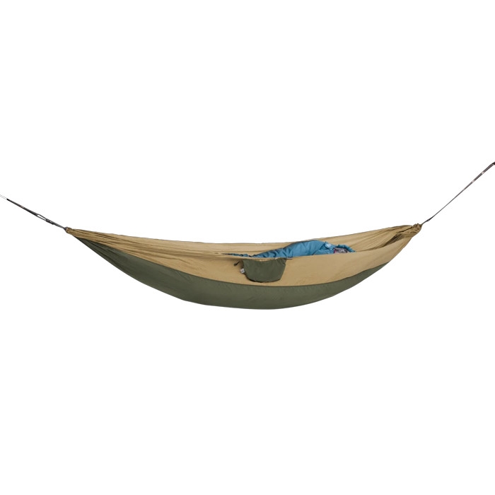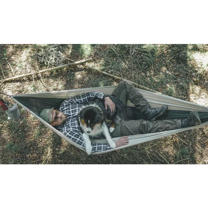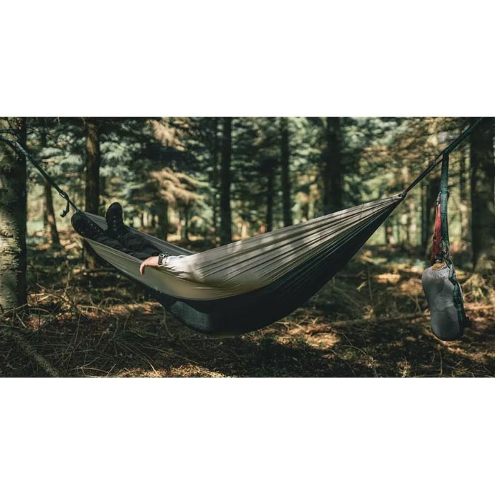 Designet er inspireret af “leave no trace”-tankegangen, hvilket gør det ideelt til dig, der ønsker at overnatte i naturen med minimal påvirkning. Den slidstærke hængekøje i genanvendt nylon kombinerer lav vægt med høj komfort, og den kompakte pakkestørrelse gør den nem at have med i rygsækken.