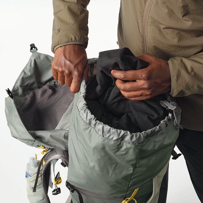Rygsækken har et polstret rygstykke og et letvægtsnet, der kun rører ryggen på ét punkt for optimal luftcirkulation. Justerbare skulder- og bryststropper samt løftestropper gør det nemt at tilpasse pasformen, mens kompressionsstropper på både top og bund hjælper med at stabilisere oppakningen. Hydrering er let med ophæng og udgang til drikkesystem, og der er plads til både bløde flasker og en 2 liters vandbeholder.
