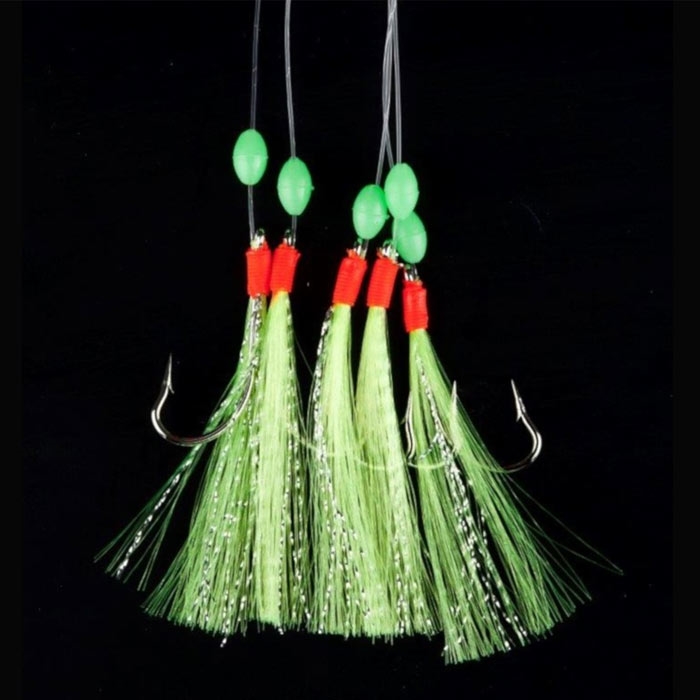 Specielt makrelforfang med 5 store kroge, pyntet med lange fjer.