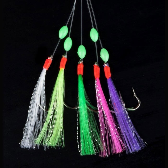 Specielt makrelforfang med 5 store kroge og fjer i 5 forskellige farver.