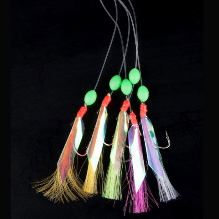 Søvik makrelforfang Model 229 har 5 kroge og er pyntet med fjer og hvid fiskeskind. Der er selvlysende ovale plastperler ovenover krogen.