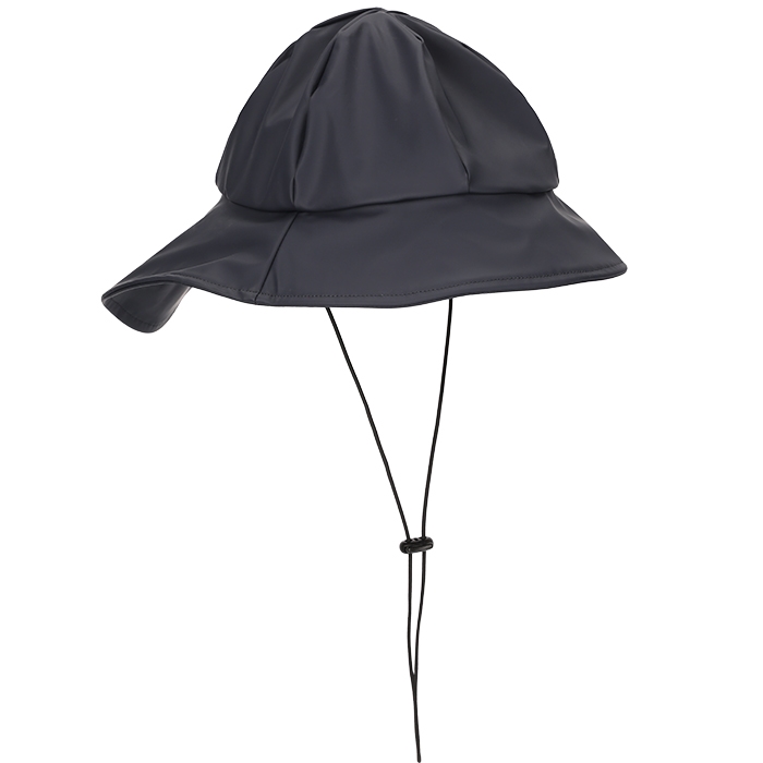Vandtæt og stilren regnhat i fleksibelt PU med justerbar snøre under hagen, der sikrer optimal pasform og stabilitet i blæsevejr.