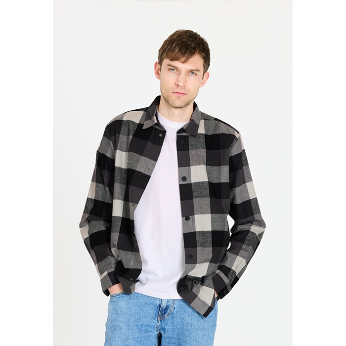 Ternet skjorte til mænd i sort, hvid og grå, lavet af 100% bomuld, som kan bruges lukket eller åben over en t-shirt for et stilfuldt og afslappet look.